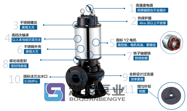 1、采用獨特的雙流道無堵塞葉輪結構,提高污水污物的過流能力和排污能力。